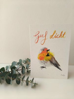 Alle items zijn handgetekend of geschilderd door Audrey. Ieder werk is uniek. Kenmerkend is het gebruik van dieren/vogels om emoties of woorden te ondersteunen.